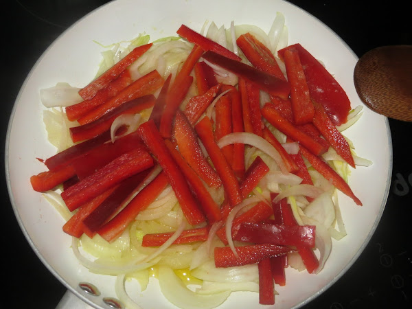 Echamos el chorro de aceite de oliva virgen extra en la sartén y añadimos el ajo cortado en trocitos y la cebolla y el pimiento cortado en juliana y salamos. Pasados 20 minutos a fuego medio bajo retiramos la sartén del fuego y colocamos la mitad del sofrito en una fuente de barro apta para horno.