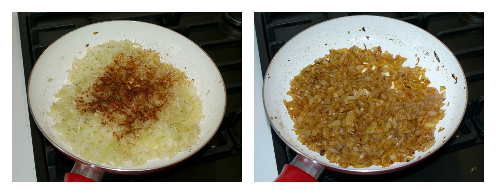 - Cuando empiecen a dorarse añadimos pimentón (a ojo, al gusto) y un poco de pimienta. Dejamos que se vaya haciendo hasta que quede todo bien pochado. Reservamos.