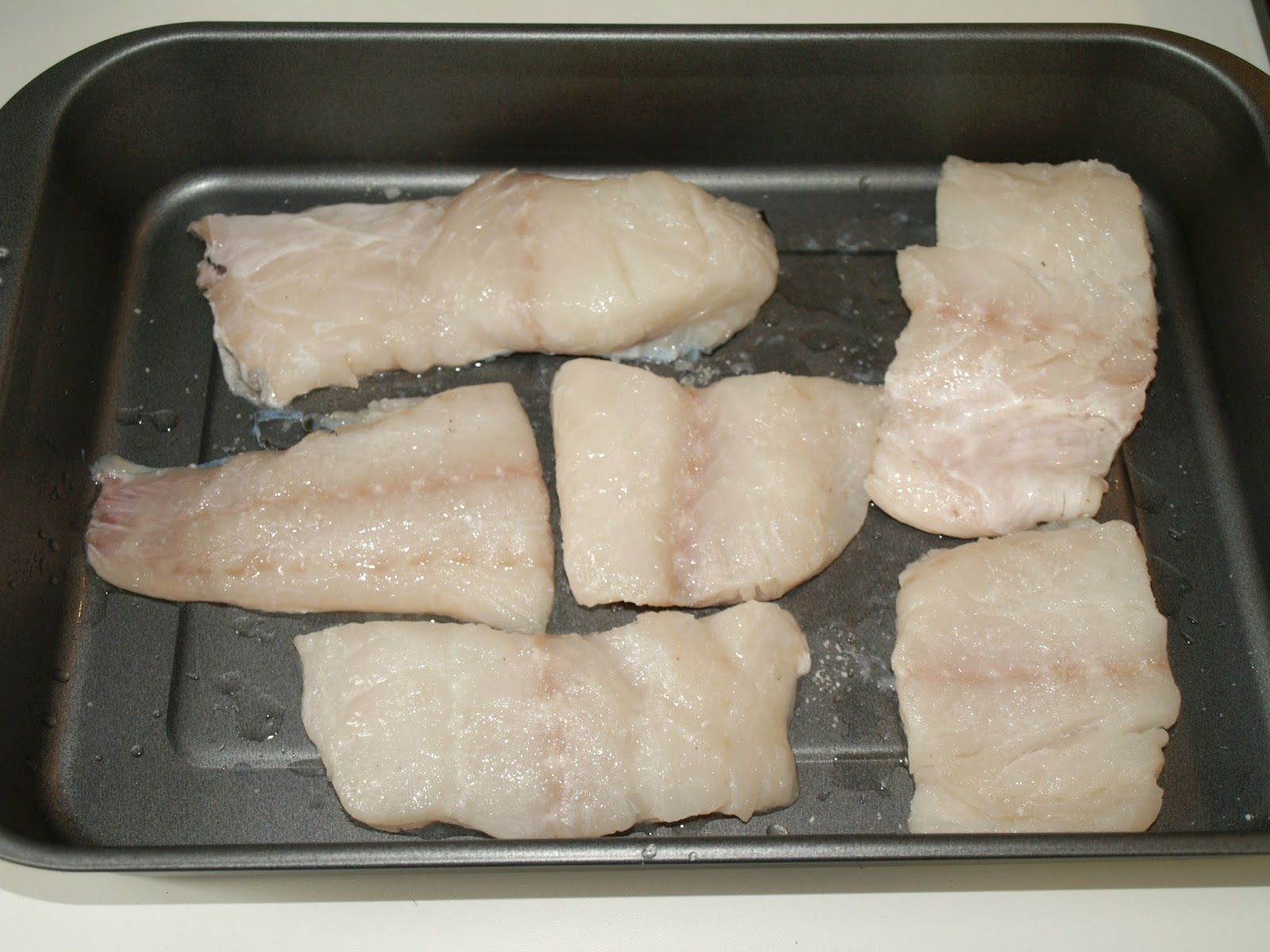 - En una fuente para horno ponemos los lomos de bacalao. Salamos un poco (si es desalado o al punto de sal, no) y añadimos un buen chorro de limón por encima.