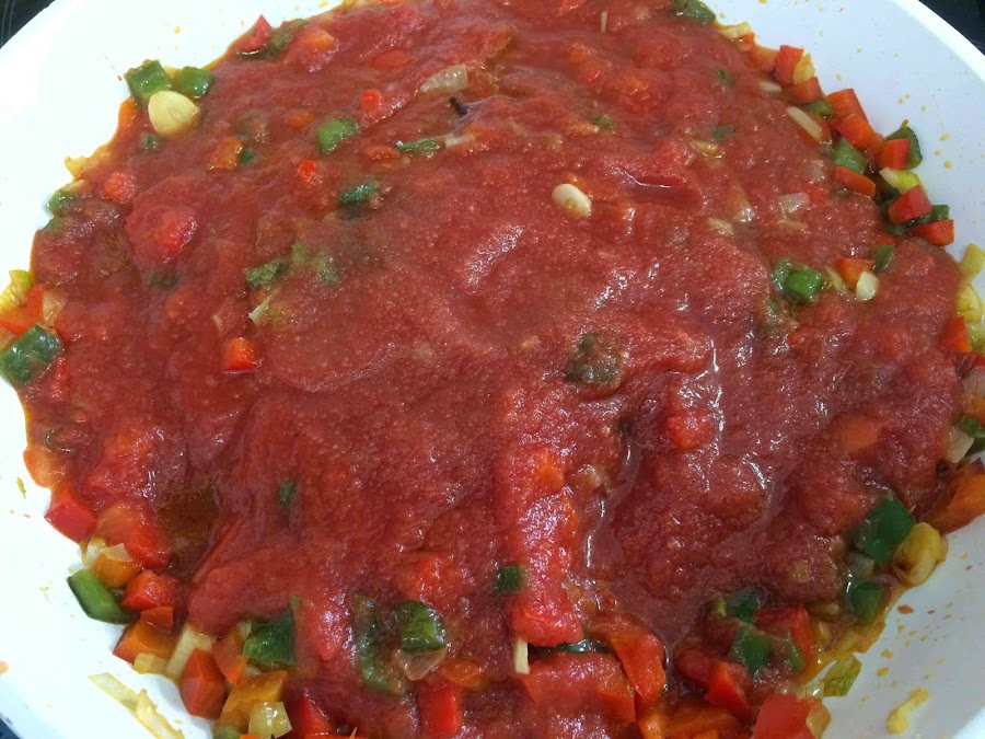 Añadimos el tomate triturado y una cucharilla de azúcar. Dejamos a fuego medio aproximadamente media hora.