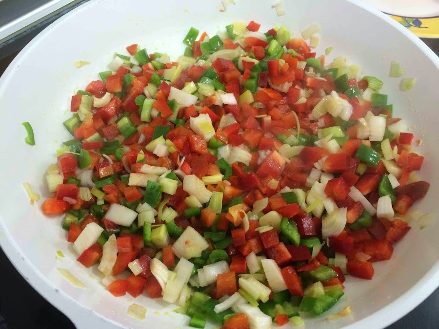 Comenzamos pelando y cortando en láminas los ajos. Los rehogamos con un poco de aceite de oliva. Cuando estén hechos le añadimos la cebolleta y los pimientos finamente cortados.