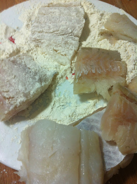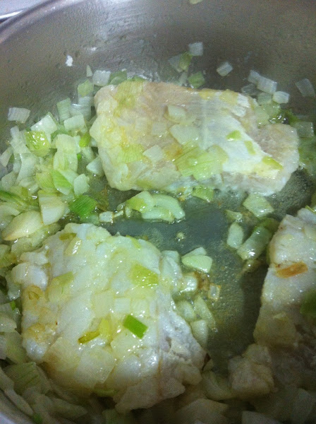 salEn una cazuela se sofríe en un poco de aceite de oliva la cebolla picada. Se pone en un plato la harina mezclada con la levadura y se enharina el pescado.