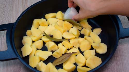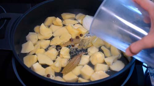 Lo primero que vamos a hacer es pelar las patatas. Una vez que las tengamos todas peladas, las lavamos y las tronchamos en dados más o menos del mismo tamaño. También las puedes cortar en rodajas.Ahora, las colocamos en una cacerola o en una olla. Agregamos 2 ó 3 horas de laurel, unos granos de pimienta y media cebolla (esto es opcional).