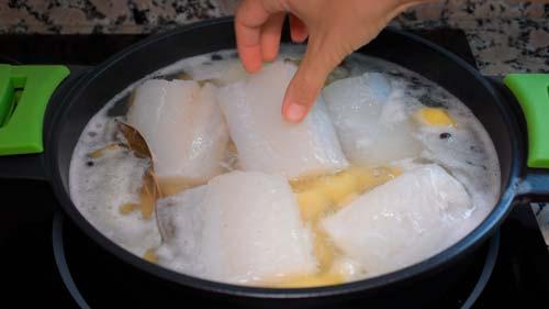 Hervimos los lomos de bacalao, bien cubiertos por el agua, durante unos 5 minutos y con la olla tapada.