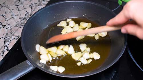 Para preparar la salsa, primero vamos a pelar y a laminar unos dientes de ajo.En una sartén, echamos un buen chorreón de aceite de oliva y lo ponemos a calentar. Añadimos los dientes de ajos y los sofreímos por unos 3-4 minutos a fuego medio.