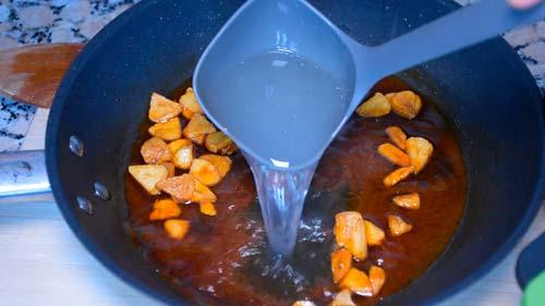 Luego, mezclamos para que los ajos se integren bien con el pimentón y le añadimos también unas 2-3 cucharadas soperas del agua de haber cocido las patatas y el bacalao. Así tendremos más cantidad de salsa y quedará más líquida para poder cubrir bien los ingredientes.