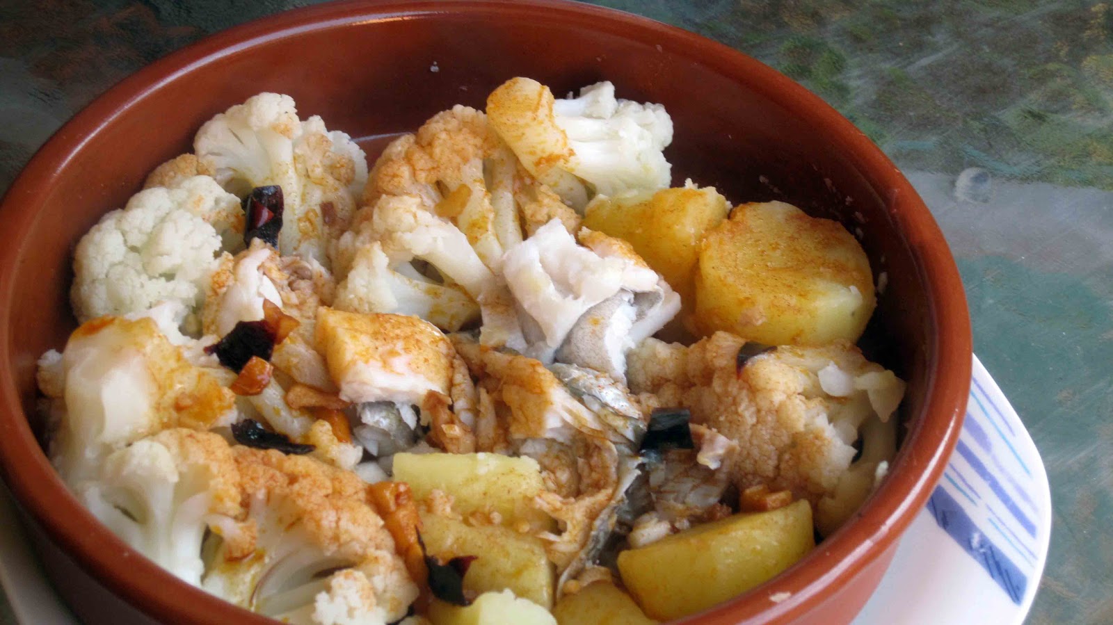 Ponemos un poco de agua con sal,en la olla, cuando empieza a hervir le añadimos, primero las patatas peladas y en trozos grandes y encima los ramilletes de coliflor. Dejamos cocer durante 5 minutos.