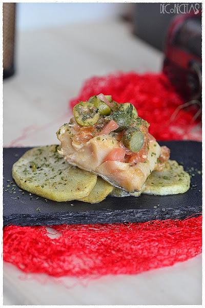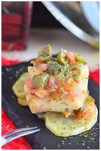 En ese aceite, pochamos la cebolla a la que añadimos el vino blanco y dejamos 5 minutos a fuego alto para que se evapore el alcochol. A continuacón, añadimos el resto de ingredientes, las aceitunas, las alcaparras, el tomate, los pepinillos y el bacalao. Lo dejamos cocinar todo conjuntamente por 10 minutos a fuego bajo.