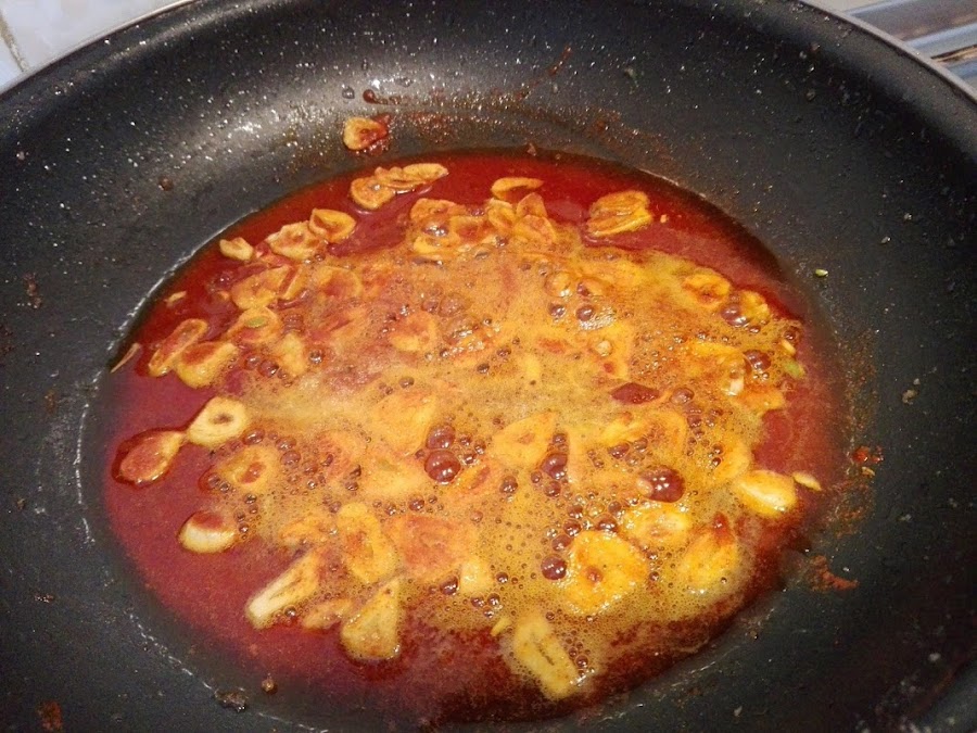 En el mismo aceite de la sartén, dorar los ajos pelados y cortados en láminas y antes que estén dorados, añadir el pimentón, remover que no se queme y agregar el vino.