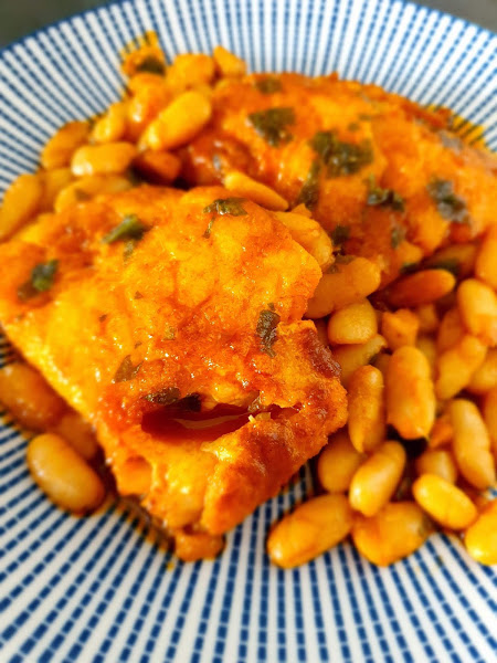 Paramos el fuego, y añadimos la salsa a la fuente donde tenemos el bacalao y las mongetes