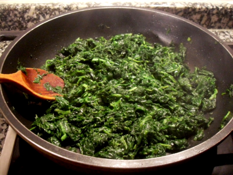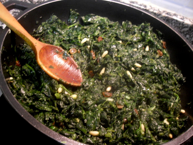 Poner un poco de aceite en la sartén si no ha quedado, añadir las espinacas y rehogar durante unos minutos hasta que ya estén listas. es posible que se tenga que hacer en dos tandas, aunque enseguida merma. Añadir las pasas y los piñones y remover.