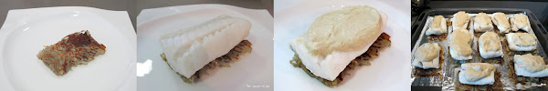 En una bandeja de horno colocar unas gotas de aceite en la base (directamente o sobre un papel de aluminio). Poner las piezas de rösti de patata y, encima de cada una, un lomo de bacalao. Cubrir la parte superior de los lomos con una cucharada generosa de muselina. Introducir en el horno con el gratinador en marcha durante unos 6 - 8 minutos aproximadamente. Jugar con la distancia del bacalao al gratinador y con la potencia de éste, para que al tiempo que dora el alioli se caliente la patata y el bacalao. No tenerlo mucho tiempo en el horno, para evitar que el bacalao se seque y pierda jugosidad.