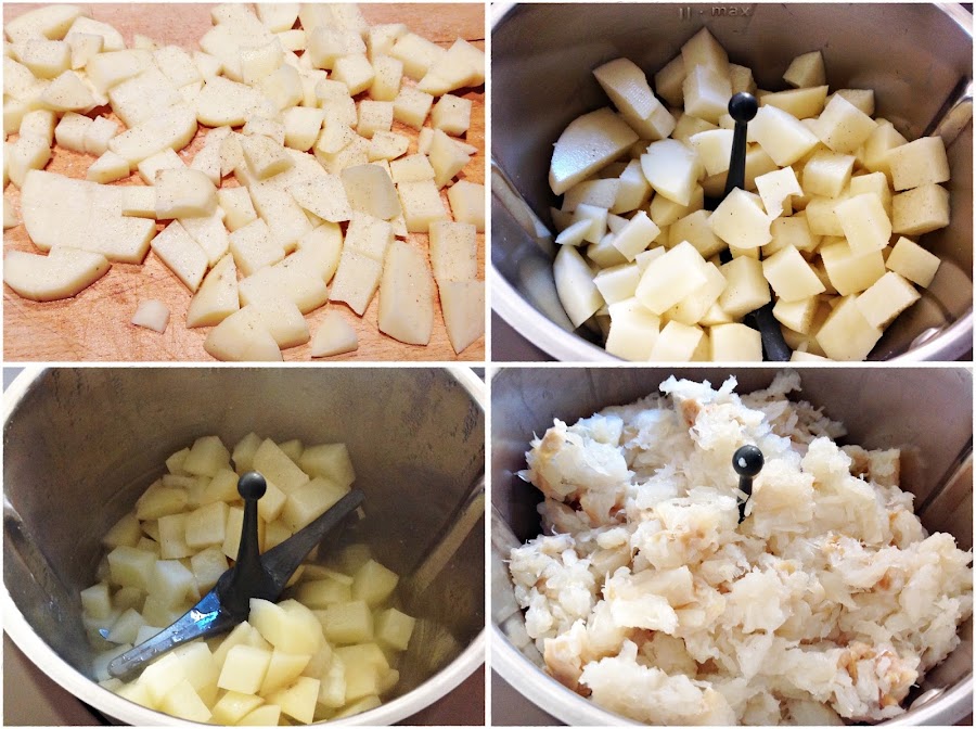 NOTA IMPORTANTE: Te aconsejo que las patatas las frías en la sartén o las cueces en el microondas, ya que alguna patata quedó un poco cruda.