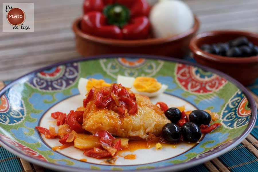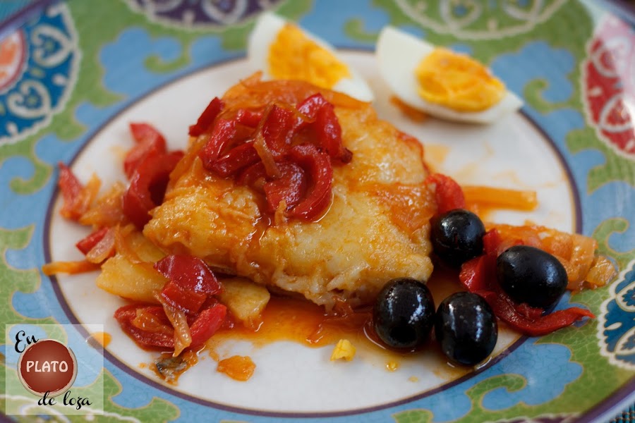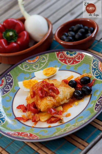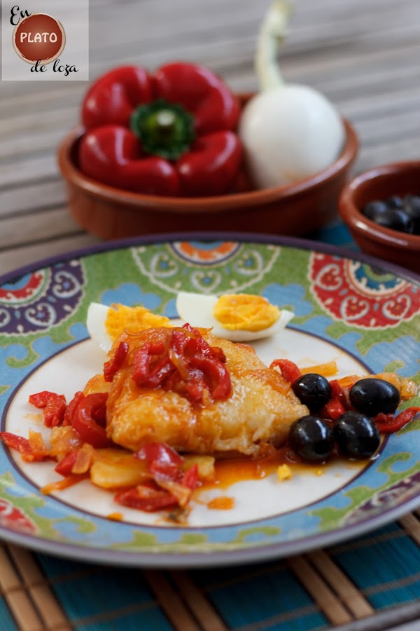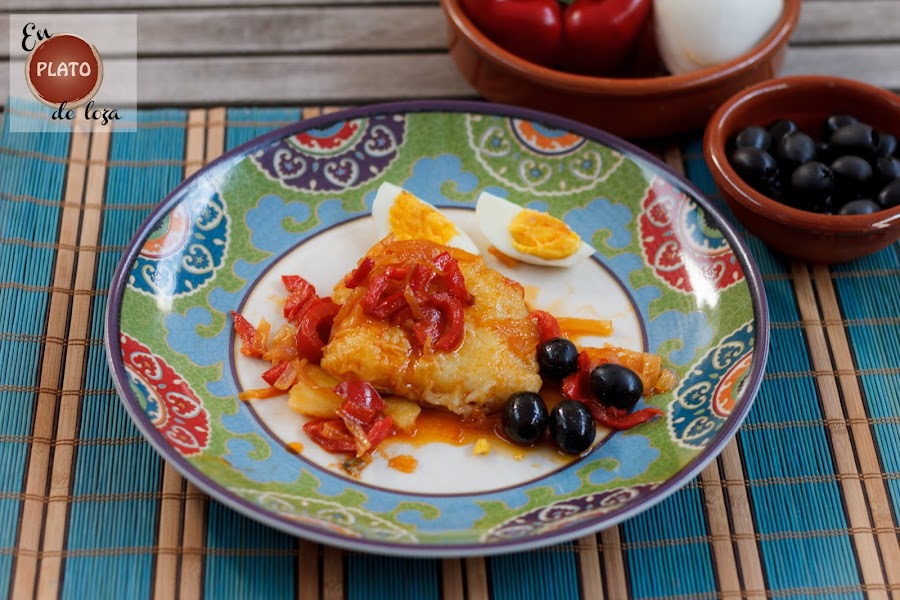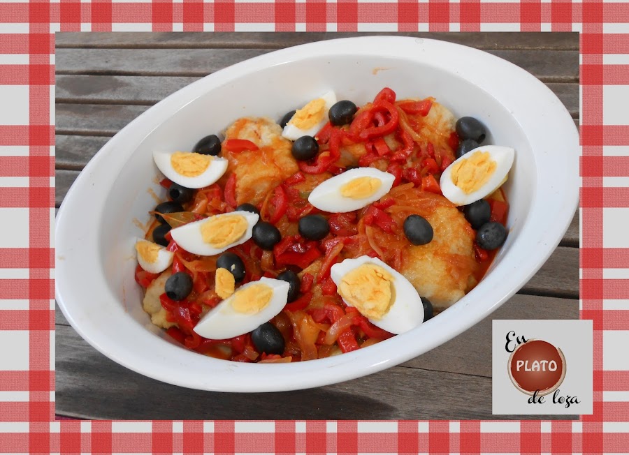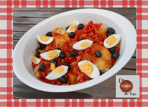 Toca emplatar, ponemos la camita de patatas, el bacalao y por encima el sofrito de pimiento y cebolla fresca. Para adornar, pero en cantidad que luego nos encanta, ponemos aceitunas negras, si son portuguesas mejor, y huevos duros cortaditos en gajos.