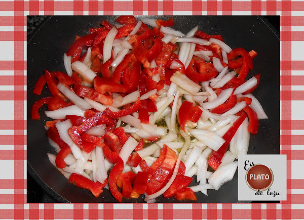 Pues a ponerse el delantal y a cortar en juliana el pimiento y la cebolla fresca: