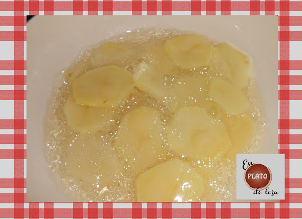 Mientras tanto, entre cocción y cocción pelamos las patatas, las cortamos en panaderas y las pochamos dejándolas blanditas.