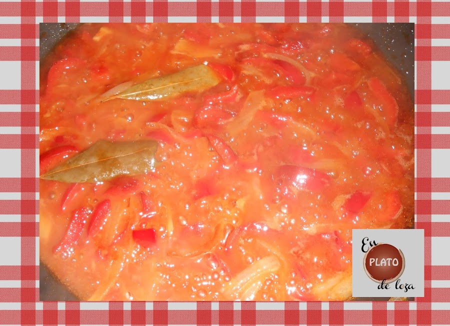 Es una de esas recetas que hay que preparar por partes así que seguimos por aquí pero hay que intercalar el resto. Sofreímos la cebolleta y el pimiento rojo con un par de granos de pimienta y el laurel, cuando estén pochados le echamos una cucharadita de pimentón de la Vera y apenas un minuto removiendo le echamos medio vaso de vino. Dejamos que reduzca y si aún vemos que la verdura no esta hecha le echamos un poco de agua y dejamos hervir. Reservamos.