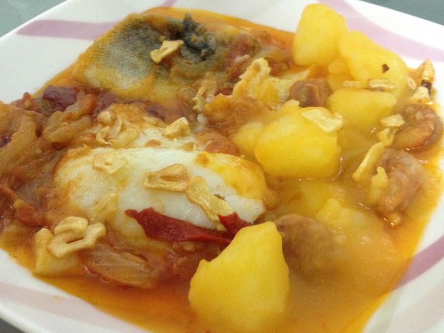 8º - Añadiremos a la cazuela las tajadas de bacalao que hemos dorado anteriormente . Dejamos cocinar durante cinco minutos más y servimos en la mesa decorado por el ajo y acompañado por las patatas a ala riojana .