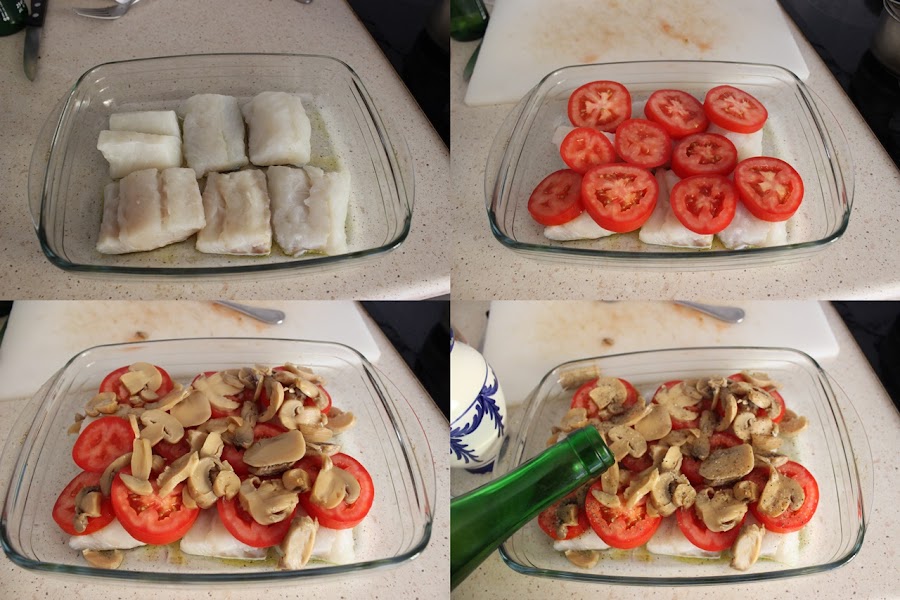 Untamos una fuente de horno con aceite de oliva. Colocamos los filetes de bacalao encima y lo cubrimos con rodajas de tomate y los champiñones laminados. Les ponemos sal y pimienta al gusto y los metemos al horno precalentado a 180ºC durante 20 minutos.
