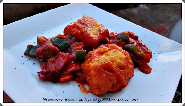 En la misma sartén ponemos aceite y echamos los ajos ya laminados y en cuanto empiezan a dorarse ponemos el lomo de bacalao cortado en trozos y siempre con la piel hacia arriba, y dejamos dos 5 minutos a fuego medio, les damos la vuelta para tostar un poco la piel y añadimos la salsa de tomate que hemos preparado previamente y lo dejamos cocinar junto 10 minutos para que se mezclen todos los sabores.