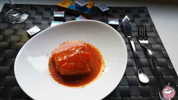 Otra noticia es que he prescindido de la sal en esta receta porque la pastilla de Avecrem Dúo Paella de Gallina Blanca le aporta más sabor con su combinación de pescado, marisco y azafrán. Así que este bacalao a la vizcaína no tiene complicación ninguna como podéis ver. He seguido la receta de la página aunque con alguna modificación... pocas, pero he evitado enharinar el bacalao para sellarlo antes de cocinarlo con la salsa.