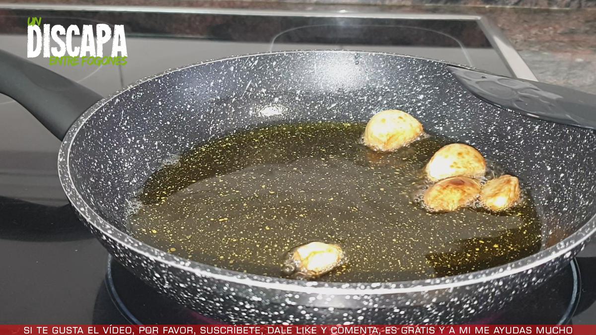 2Mientras se hidratan los pimientos, ponemos un buen chorro de aceite en una sartén y dejamos que se caliente a fuego medio. Mientras se calienta el aceite, pelamos unos dientes de ajo y los incorporamos a la sartén y dejamos que se vayan dorando.