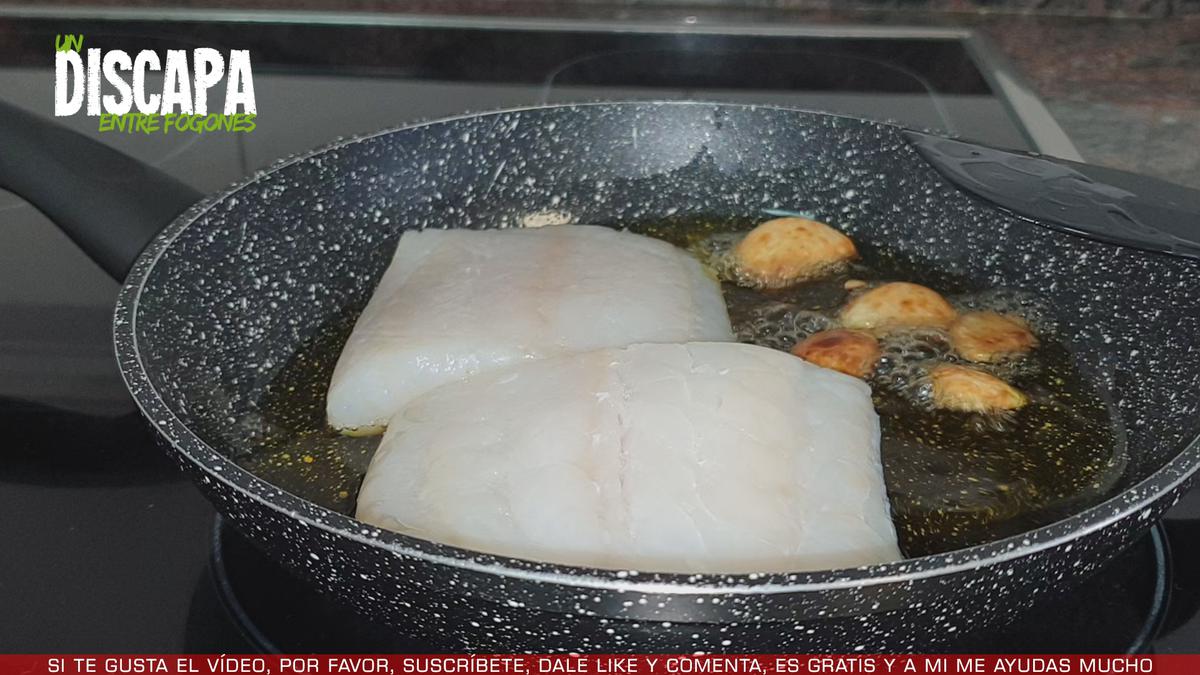 3Cuando los ajos ya han cogido color, añadimos el bacalao por el lado de la piel y dejamos que se cocine a fuego bajo durante 2 minutos por cada lado.
