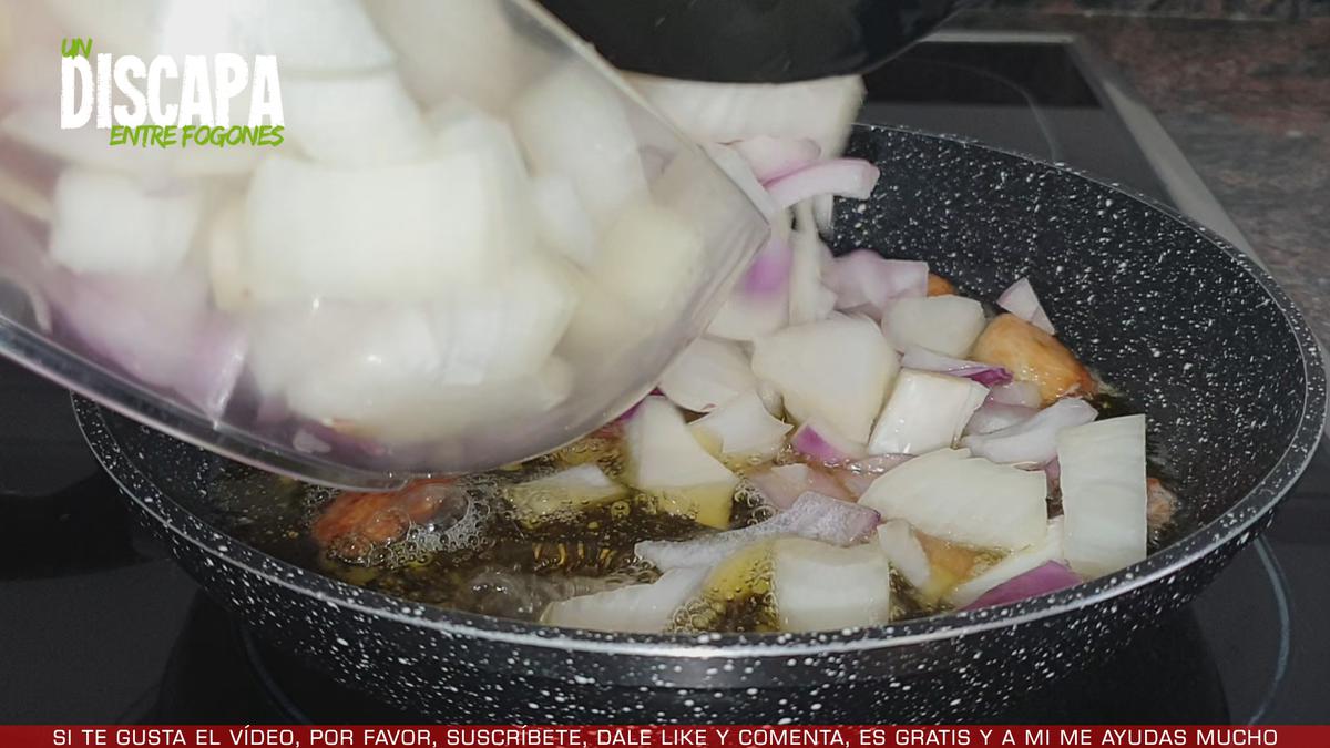 5Retiramos el bacalao y añadimos la cebolla troceada, le ponemos sal al gusto y dejamos que se poche bien, a fuego medio.