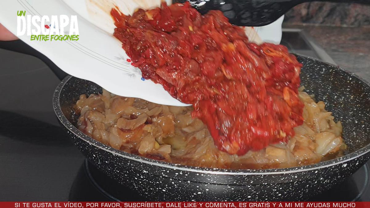 7Cuando ya le hemos sacado la carne a todos los pimientos lo incorporamos junto con la cebolla pochada. Mezclamos bien y dejamos que se cocine conjuntamente unos 5 minutos.