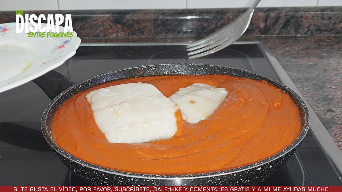 9 Y una vez triturada la salsa, la devolvemos a la sartén, añadimos el bacalao, añadimos también el juguillo que ha soltado el bacalao y dejamos que se cocine unos 5 minutos.