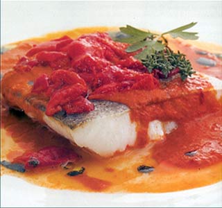 Se pone a desalar el bacalao en abundante agua, unas 36-48 horas antes, se cambia el agua por lo menos 3 veces. Se hierve el bacalao desalado unos 5 minutos, no mas porque si no se guisa demasiado para poderlo limpiar bien. Se escurre y se deja enfriar. Se limpia bien de espinas, y se le quitan los cueros que se guardan para ponerlos en el fondo del caldero y que suelte la gelatina. El bacalao no se debe desmigar mucho, sino dejarlo en trozos como de 10 cm. que se pasan por harina y se fríen hasta que están dorados. Se pasan al caldero. Hay que tener cuidado al freírlos de que la harina no se queme. Se vierte el aceite de freír con la harina frita en el caldero y se pone aceite limpia en el sartén y se hace una fritura con la cebolla picada y el pimiento picado igual, en cuadraditos pequeños, y cuando esté empezando a dorar la cebolla, se añaden los tomates pelados y picados y se dejan ablandar, tapando el sartén, y bajando el fuego. Se escacha todo y se echa al caldero. Se hace un majado, en la picadora o en el almirez, con 5 dientes de ajo, un puñado de almendras y un poco de perejil, como 10 ramitos, sin los tallos, y se pone en el caldero. Se añade el agua que cubra el bacalao, puede ponerse el agua en que se hirvió, si está bien desalado, si no poner agua nueva, y se hierve unos 5 minutos y se añade sal, si lo necesita, probando la salsa. ¡Cuidado al hervir que se pega al fondo!, sobre todo si se recalienta, hay que mover con una cuchara.