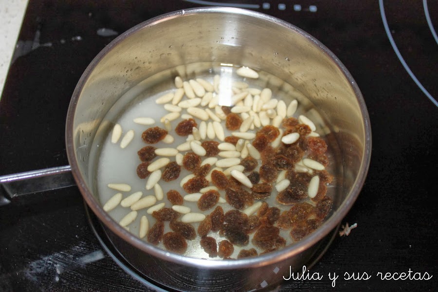 En un cazo ponemos el agua, las pasas, el vinagre, los piñones y el azúcar, lo dejamos cocer a fuego medio 5 minutos.
