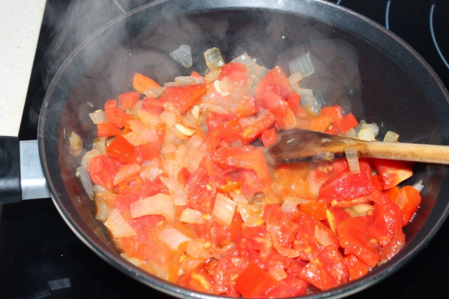 En una sarten ponemos un poco de aceite y sofreímos la cebolla, los ajos y el pimiento picados, añadimos el tomate y dejamos que se termine de sofreír, al final le añadimos el pimentón para que no se queme.