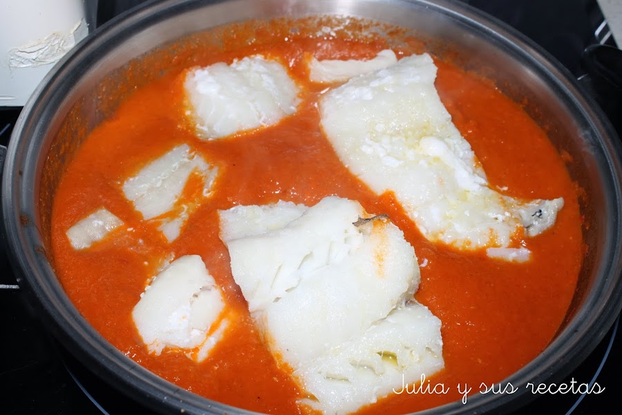 Lo echamos en una cazuela y le añadimos una poquita agua, 1/2 vasito, si vemos que está muy espesa la salsa y dejamos cocer un minuto o dos, rectificamos de sal y echamos el bacalao. Lo dejamos cocer 1-2 minutos.