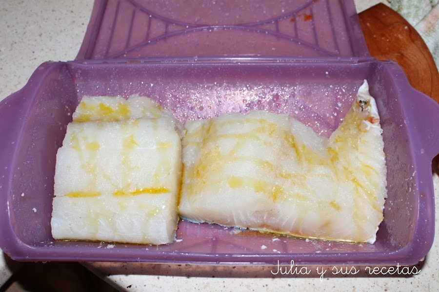 Ponemos el bacalao en un recipiente para cocer al papillote y le echamos un chorrito de aceite de oliva por encima, lo cocemos al microondas 3 minutos al máximo, sacamos le damos la vuelta y lo dejamos otros 3 minutos mas al máximo. Lo dejamos reposar dentro del microondas 2 minutos. Reservamos.