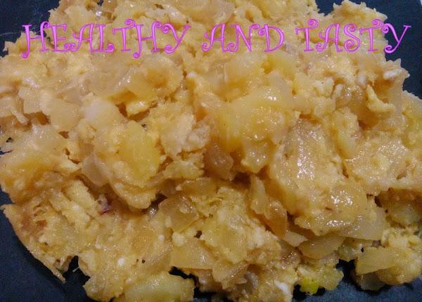 En una sartén con 2-3 cucharadas de aceite, pochamos la cebolla cortada en juliana (en tiras). Cuando la cebolla esté pochada, añadimos el bacalao y rehogamos todo junto. Por otro lado freímos las patatas cortadas en tiras en abundante aceite a fuego lento, para que queden blanditas y jugosas. Añadimos las patatas fritas a la mezcla de cebolla y bacalao y dejamos cocinar unos 2 minutos a fuego medio. a continuación, batimos los huevos con una pizca de sal (no mucha porque el bacalao ya es salado) y los añadimos a la sartén. Removemos todo bien con una cuchara de madera para que se mezcle todo. Dejamos cocinar a fuego lento removiendo de vez en cuando hasta que el huevo se haya cuajado.