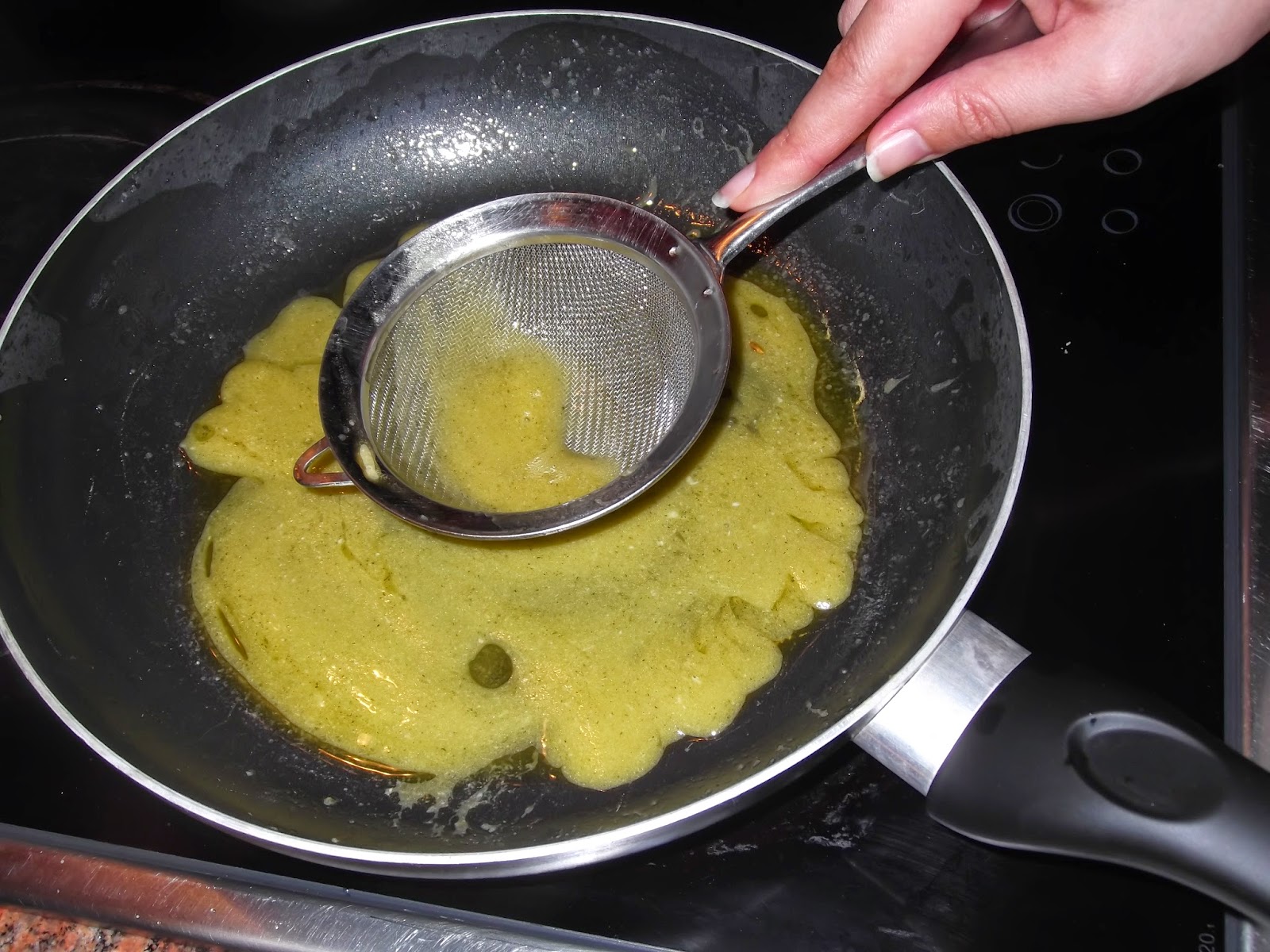 Una vez que el aceite esté templado, si lo hacéis con aceite caliente, no os va a ligar el pil pil, vamos echándolo poco a poco en la sartén donde habíamos frito el bacalao y cogemos un colador y lo vamos moviendo de un lado a otro de la sartén para que se ligue el aceite y se forme en el famoso pil pil, también echamos la gelatina del bacalao que haya soltado en el plato donde lo hemos puesto a reposar. Poco a poco con un cazo vamos añadiendo todo el aceite y ligándolo, si veis que os queda muy espeso podéis añadirle un poco de agua, pero seguramente no haga falta. Una vez que lo tenéis a la textura adecuada, podéis meter el bacalao en la misma sartén para que se temple y si el pescado no está muy frío lo ponéis directamente en el plato y le servís el pil pil por encima con unos cuantos ajos y el perejil para adornar. De las dos formas el plato está exquisito y que no se os olvide añadir un par de ajos fritos a cada plato que están de lujo y para los más picantes también se pueden atrever con la guindilla.