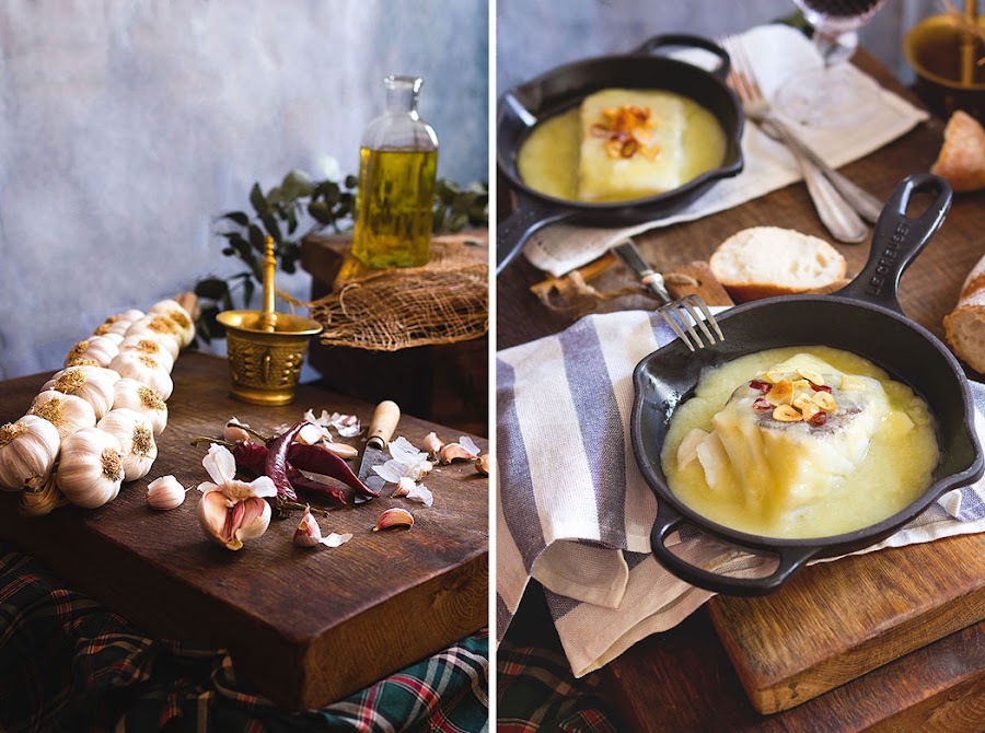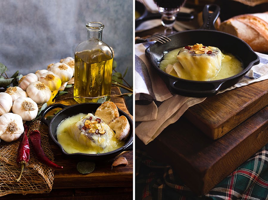 Antes de presentar en la mesa, calentamos a fuego muy lento dando un meneito a la cazuela antes de emplatar. Servimos con los ajos y las rodajas de guindilla reservados.