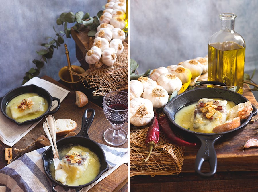 Para la preparación de ésta receta se necesita tan solo cuatro ingredientes, bacalao, generalmente en salazón, aceite de oliva virgen extra suave, ajos y guindilla además de una cazuela de fondo ancho para que los trozos de bacalao quepan con amplitud y poder hacer ese vaivén tan característico que hace que se ligue la salsa.