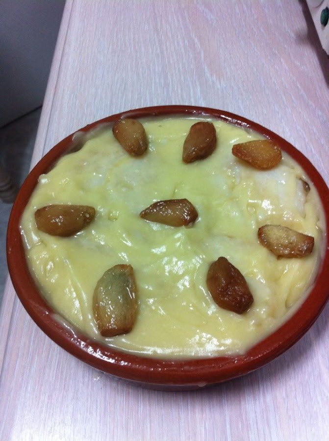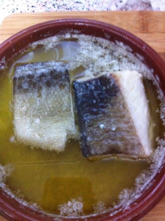 * En el mismo aceite donde hemos dorado los ajos,ponemos a confitar el bacalao pero ya en la cazuela de barro, al principio empezamos colocandolo con la piel hacia arriba.