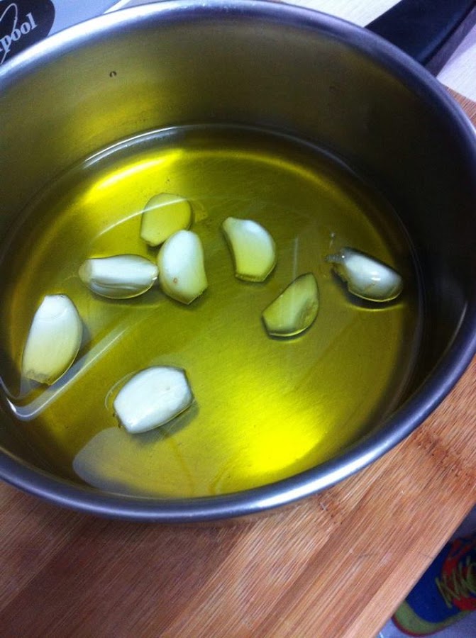 * Ponemos el aceite de oliva a calentar a fuego bajo, doramos los ajos y los recebamos.