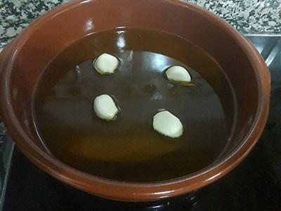 Ponemos el aceite en una cazuela y, cuando esté caliente, añadimos los ajos y la guindilla. Dejamos al fuego hasta que se hayan dorado, los sacamos y retiramos la cazuela del fuego para que se enfríe un poco el aceite.