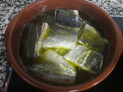Volvemos a poner la cazuela al fuego, e introducimos el bacalao con la piel hacia arriba. Lo cocinaremos a fuego muy suave, sin que el aceite llegue a hervir, meneando de vez en cuando la cazuela, de esta forma es bacalao se irá confitando poco a poco e irá soltando su gelatina, con la que luego ligaremos el pil pil. Dependiendo del grosor del bacalao, necesitará más o menos tiempo en el fuego, yo suelo darte la vuelta en el último momento para que termine de hacerse bien por los dos lados. Cuando esté cocinado, lo sacamos y reservamos.