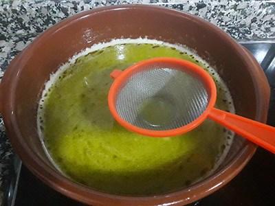 Pasamos el aceite, junto con la gelatina que ha soltado el bacalao, a otro recipiente y lo dejamos templar. Para que nos ligue bien la salsa, el aceite debe estar templado, ni muy caliente ni frío. Ponemos una parte de aceite de nuevo en la cazuela, volvemos a colocar al fuego y, con un colador vamos haciendo movimientos circulares continuamente, para que emulsione la salsa. A medida que la salsa va espesando vamos incorporando aceite y seguimos moviendo el colador, hasta que la el pil pip esté bien ligado y hay espesado a nuestro gusto.