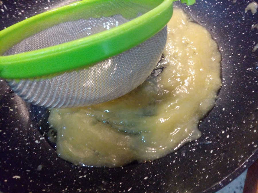 Si la salsa no ha emulsionado bien, si no ha ligado, si no ha quedado lo suficientemente espesa y no ha quedado correcta, sacar los filetes de bacalao del recipiente, reservarlos y con un colador realizar movimientos circulares hasta conseguir la consistencia deseada.