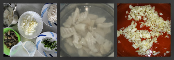 La receta la comenzamos la noche antes poniendo el bacalao a desalar y dejando las almejas en abundante agua con sal.