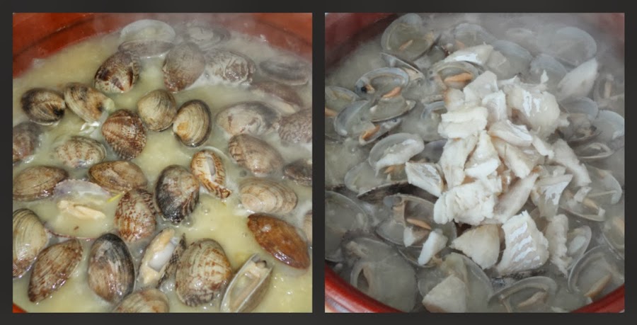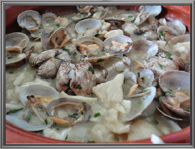 Bien calentita ideal para los días de otoño y para un día cualquier o para vestir una mesa porque una mezcla de bacalao y almejas es de "fiesta" y si la preparamos en fuente de barro todavía mucho más rica!!