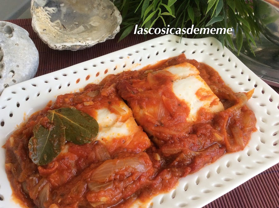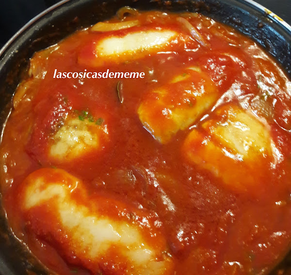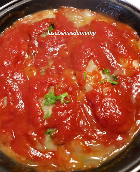 Pasados los 5 minutos echamos por encima el tomate, movemos bien y dejamos que se termine de hacer el bacalao como vemos en las otras fotos.