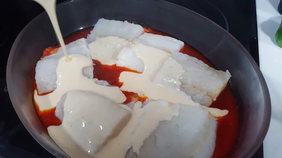 8.- Una vez hecha volcamos la bechamel sobre el bacalao y espolvoreamos el queso rallado.
