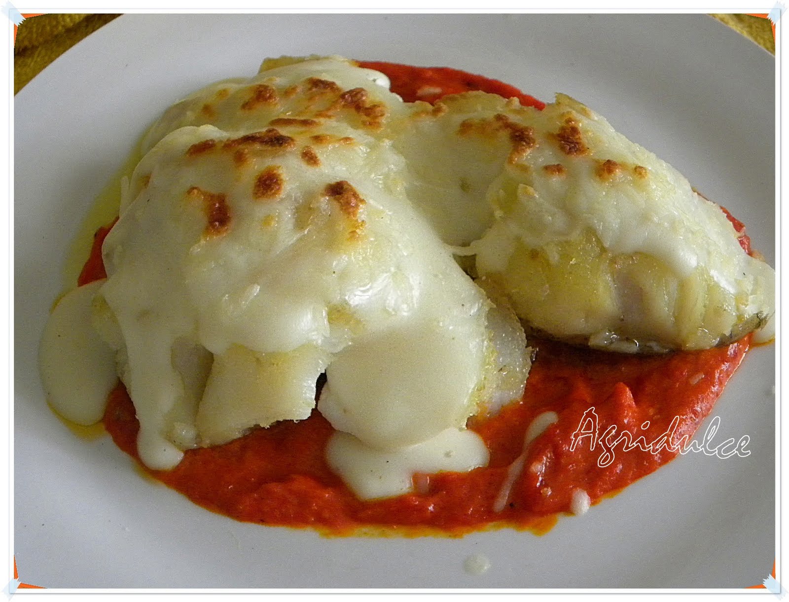* Sobre la salsa de pimientos colocamos los trozos de bacalao y cubrimos con la